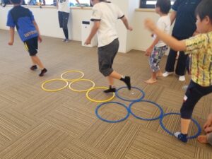 あそび場☆まなび場+スポーツでは、ハードル・ラダー・マット・リングを使用したトレーニング、ボールを使った運動等を実施しています。