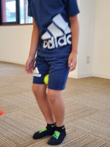 テニスボールを使ったトレーニングなんですが、これは”テニスボール”を内太ももに挟んで落とさないように両足でジャンプしながら進むトレーニングです。